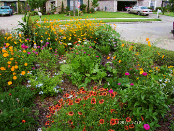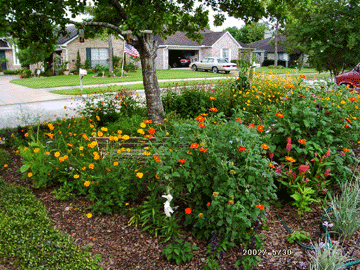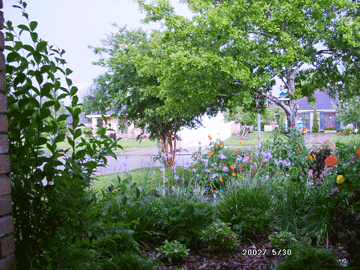 Above: looking toward the front porch. (The patch of grass in the lower right corner is our neighbor's.) The tall plant (foreground) is a Texas mountain laurel. Behind that are two sweet olives. At the base of those is peppermint. Then on to the left, a cotton plant, more society garlic, zinnias. Also in this bed (not visible in the picture) are bell peppers, dill, cilantro, Copper Canyon daisy, star jasmine, purple basil, marigolds, Mexican petunia.