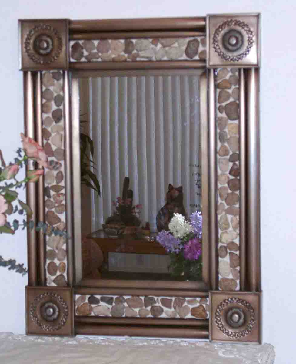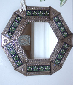 Several types of lovely mirrors with hand- punched and hand-tooled tin frames. Some frames have inlaid handmade Talavera tiles (left); the one on the right has inlaid stones. Click HERE to see more mirrors. | ![]() |