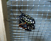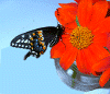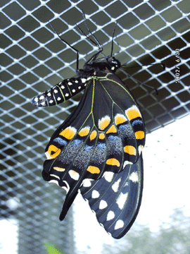 This is a male, I think. They don't have as much blue on the bottom part of the upper surface of the wing. We put him on flowers in a vase while his wings dried. We set the vase on the front porch, and before long, he flew away to share his beauty with others. Isn't he BEAUTIFUL??? Watching this