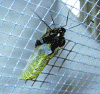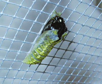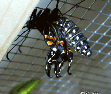 Saturday morning, 6/29/02 - The first of our seven hatched out! Left to right, the butterfly is emerging from the chrysalis. |