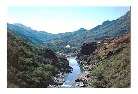 The bus trip to the bottom of the canyon takes seven or eight hours. Batopilas (population 1,150) occupies one single, narrow street along the river with towering canyon walls rearing up in all directions. Temperatures are some 30 degrees warmer than at the top of the canyon and you find that forests of cactus have replaced stands of pine. With near tropical weather in the winter, the summer months are said to be almost unbearably hot and humid. (In the picture you can barely see the white streaks, which are the switchbacks of the road that we would eventually reach on our downward journey.)